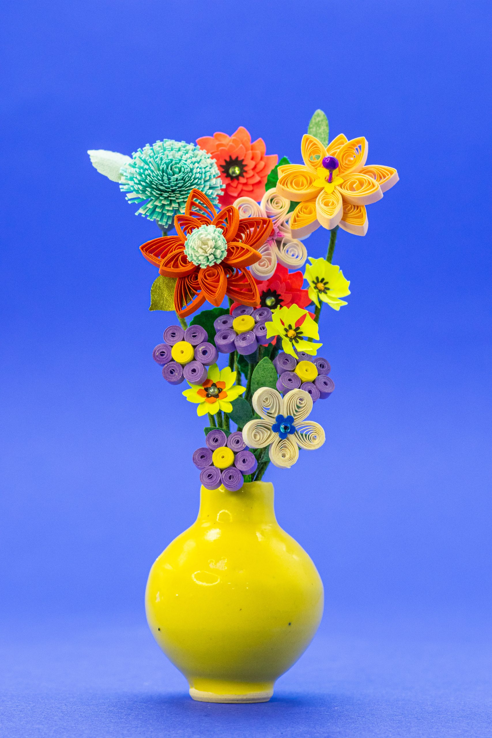 Yellow ceramic vase with purple and red-rust color flowers that are made from paper. The paper varies from 1/6 to 3/8 of an inch wide. The methods used are both punch art and quilling. May contain beads, rhinestones or other tiny objects. Vase is approximately 1.75-inches tall, overall piece is 4.5 to 5-inches tall. The vase is made by a local artist.